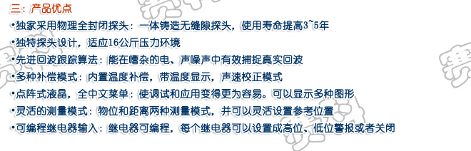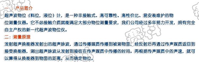 產(chǎn)品概述:產(chǎn)品描述:(防爆型)超聲波物位(料位,液位)計(jì),是一種非接觸式、高性價(jià)比、易安裝維護(hù)的物位測(cè)量?jī)x器。它不必接觸介質(zhì)就能滿足大部分物位測(cè)量要求,我們公司經(jīng)過(guò)多年努力開(kāi)發(fā),擁有自主產(chǎn)權(quán)的新一代(防爆型)超聲波物位儀。